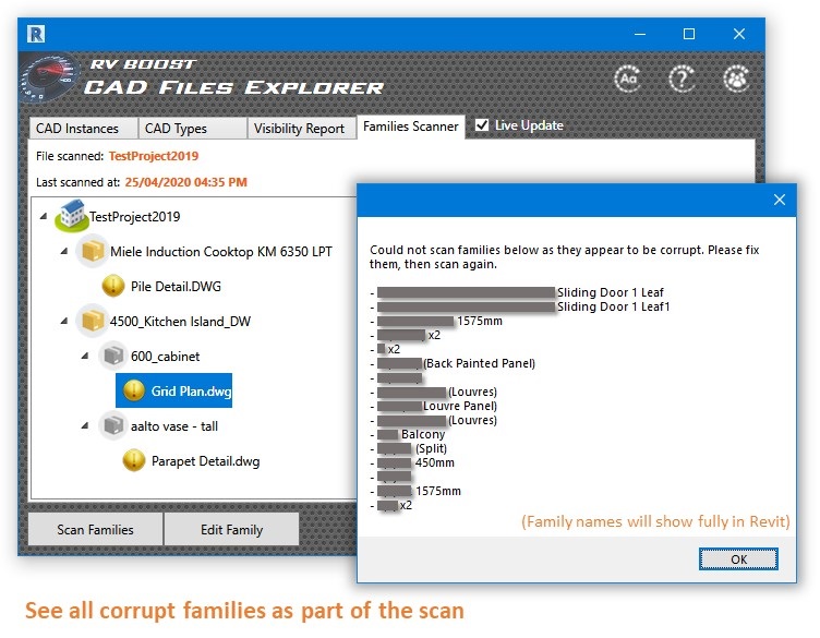 - Scan all loaded families in the project to find nested CAD files at any nesting level. Any corrupt families will be listed as well.