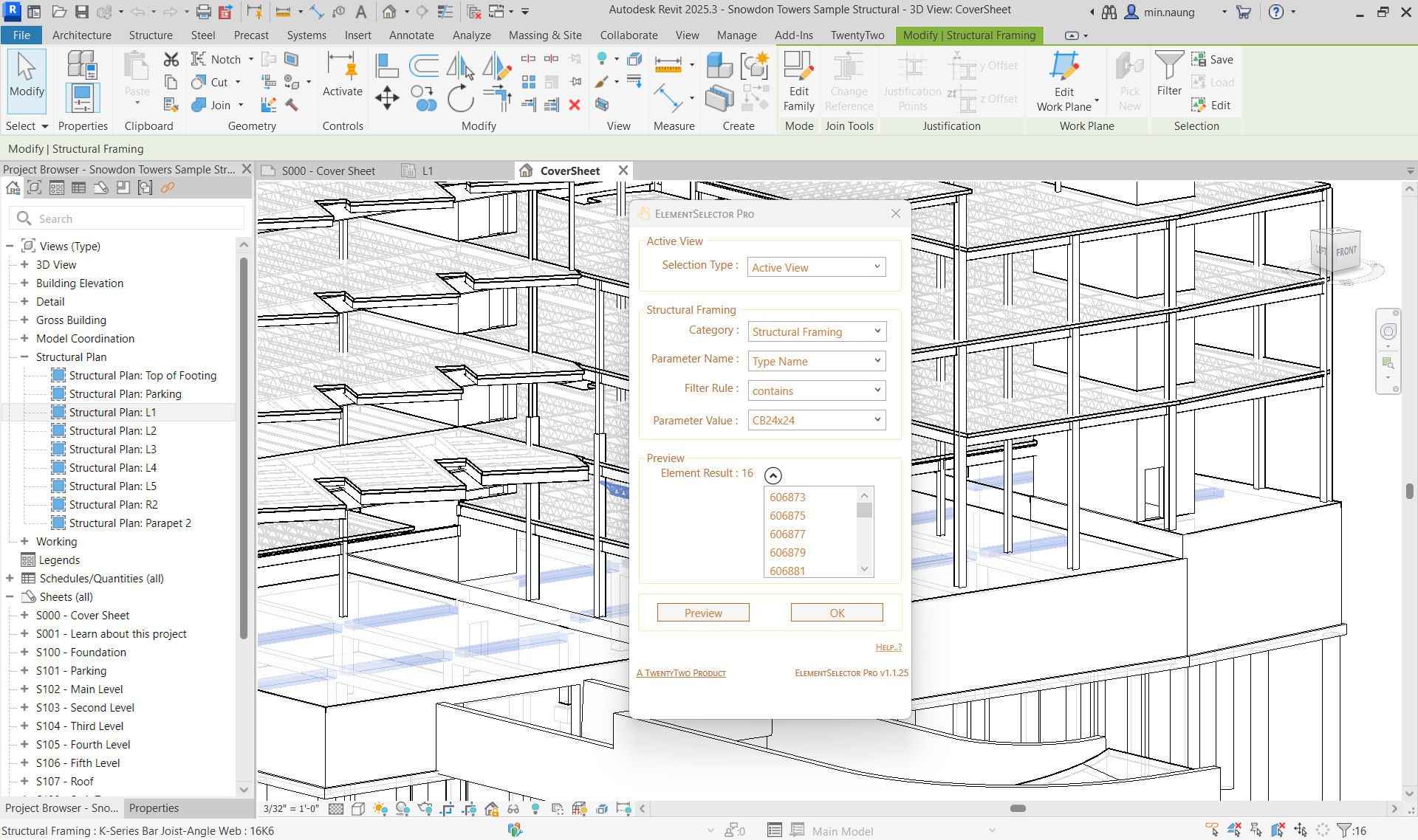 ElementSelector Pro is a free Autodesk® Revit® application that enables users to efficiently filter, preview, and select elements within various scopes such as an active view, a specific level, the current selection, or the entire project. This versatile tool allows users to narrow down their selections based on element category and parameter values. Furthermore, ElementSelector Pro offers several additional convenient features, including: