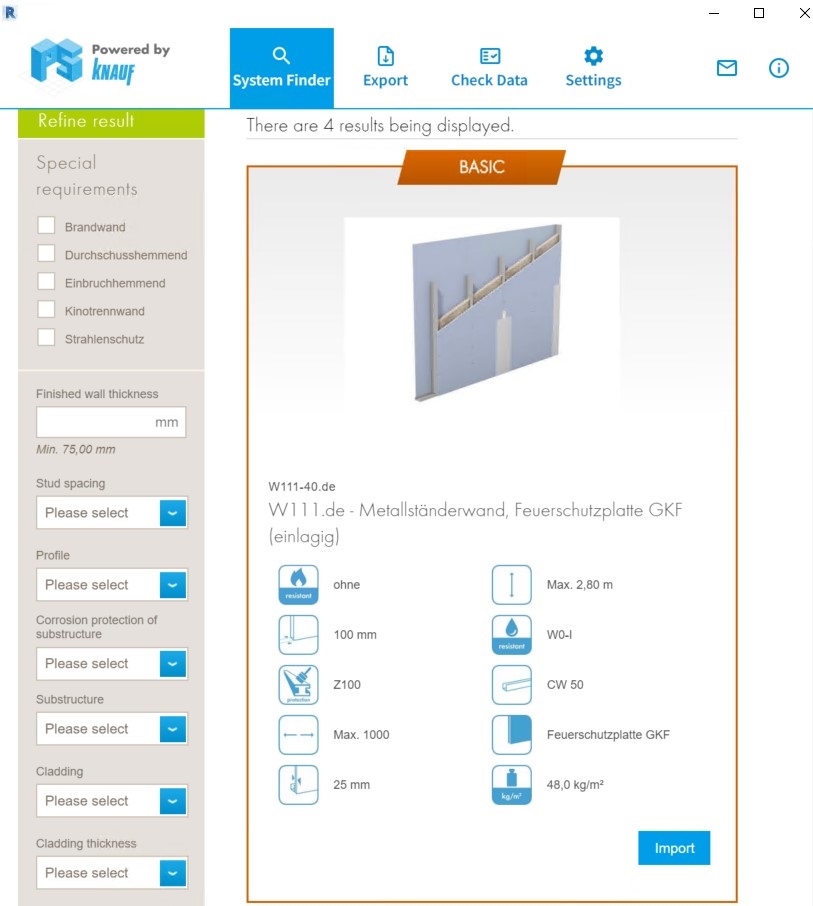 The Plug-In allows you to find and insert Knauf products and systems directly within Autodesk® Revit®. Based on simple questions, it gives you an overview of systems that match your requirements. Furthermore, factors, such as regional availability, are considered to make sure that all recommendations are relevant for your project location – which is especially useful for cross-border projects. At the click of a button, BIM objects of your selected systems will be inserted into your BIM model including all relevant specifications.