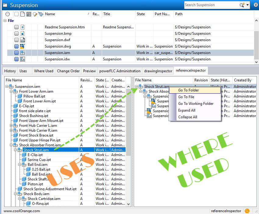 The referenceInspector combines the "Uses" and "Where Used" tab of Autodesk® Vault®.