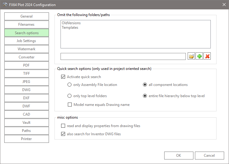 The converter functions require no setup. After selecting the drawing files, you just add/remove the required file formats from a menu and start the job. FX64 Plot provides converter functions for PDF, TIFF, JPEG, DXF, DWG, DWF and various neutral CAD formats (STEP, IGES, SAT, STL, etc.). There is no limitation on the number of selected formats - you can print and convert the selected files to all of the formats in one go. The program can copy the resulting files to a predefined target location, save each of the converted files in a separate target folder, move each of the files to the file system location of the corresponding drawing or -in the case of Vault based drawings - upload and check in the converted formats into Vault.