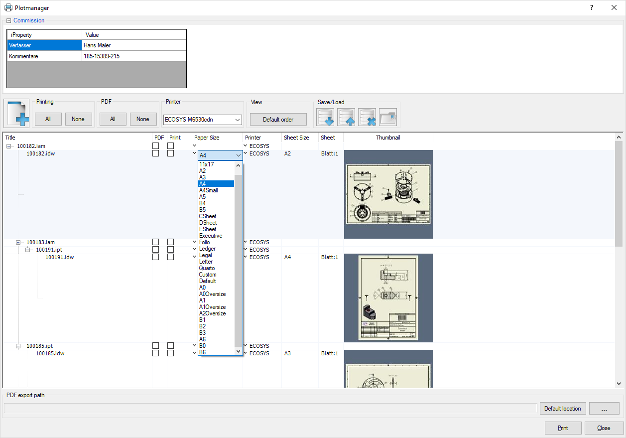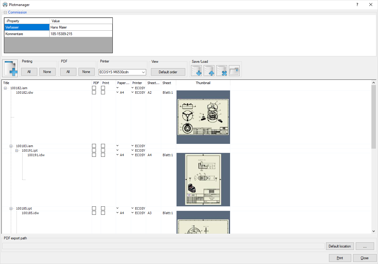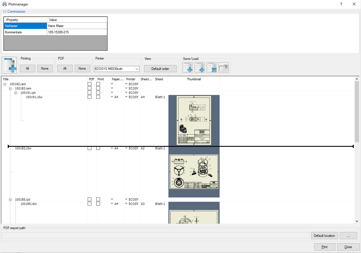 Use CAD4PLT to print all drawings of one or more Inventor assemblies directly from Autodesk® Vault® and / or export them as PDFs.