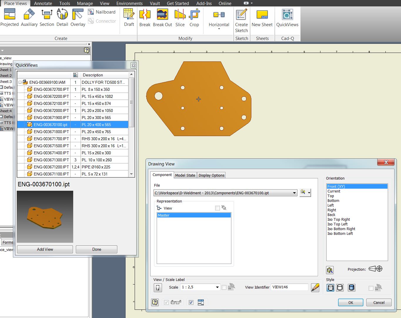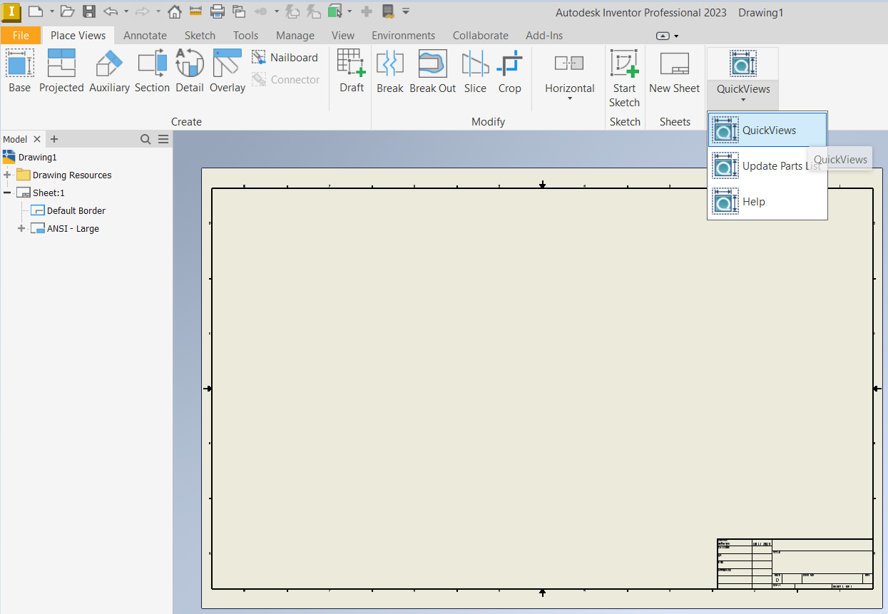 6. Locate the QuickViews button somewhere at the end of your Place Views ribbon. Click on the small arrow to get the drop-down choice and click on the Update Part List.